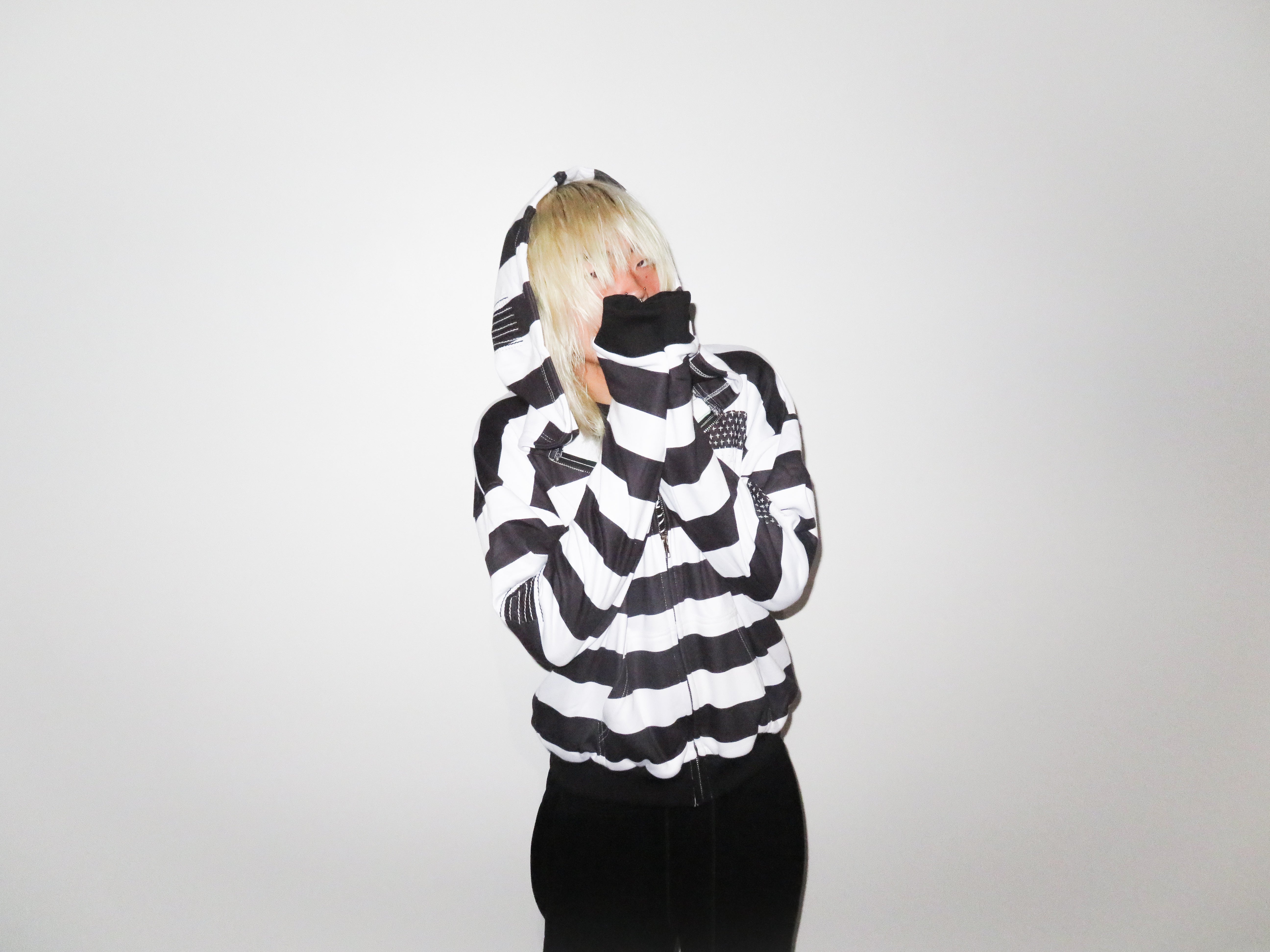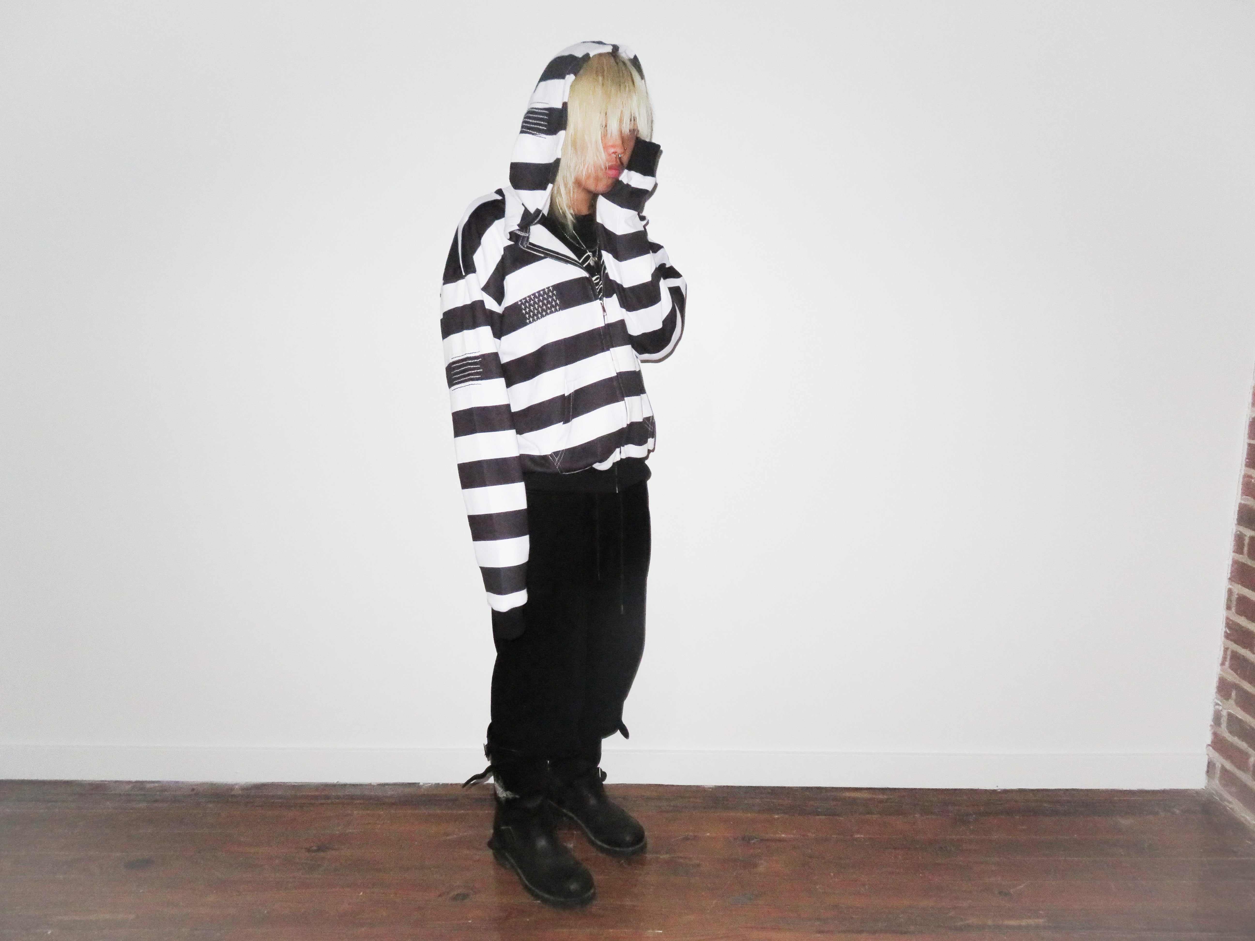 Uniform dressing meets personal disruption. The striped hoodie as a symbol of both conformity and rebellion—wearing what obscures, what reveals, what transforms. Sashiko repairs interrupt the pattern, marking moments of fracture and reformation. Each piece carries its own history.